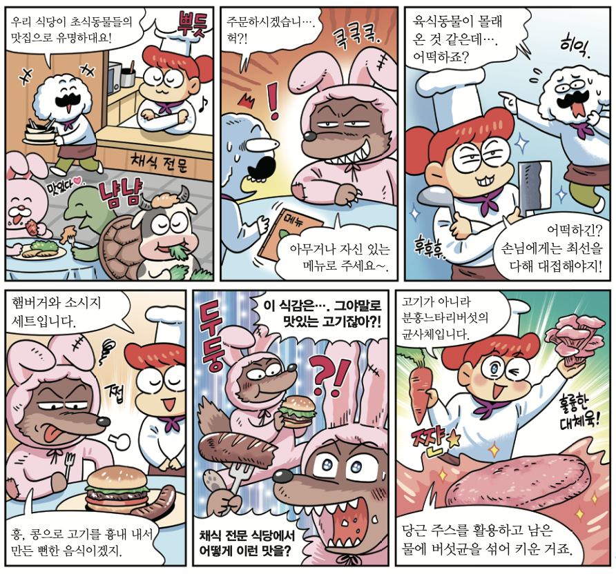 지난해 12월 17일, 독일 기센대학교 외 공동 연구팀은 당근 찌꺼기로 ‘버섯 고기’를 만드는 방법을 국제 학술지 ‘농업식품화학회지’에 발표했어요. 연구팀은 당근 주스에서 색소를 뽑아내고 남은 물에 분홍느타리버섯의 영양 기관인 실처럼 생긴 균사체를 넣어 키웠어요. 그러자 하얀 균사들이 엉켜 다진 고기 같은 단백질 덩어리가 만들어졌죠. 이 단백질 덩어리로 햄버거 패티와 소시지를 만들었더니, 시식단은 콩고기보다 맛있고, 식감도 고기와 비슷하다고 평가했어요. 연구팀은 “버려지는 음식물로 가치 있는 자원을 만드는 친환경 기술이 될 것”이라고 기대했습니다.