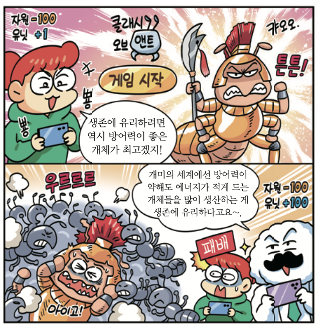 연구 결과, 껍데기에 영양분을 적게 쓴 개미 종일수록 새로운 종으로 진화하는 속도가 빨랐어. 튼튼한 몸을 고집한 종들보다, 가벼운 몸으로 숫자를 늘리는 방식을 택한 우리 종이 더 빠르고 다양하게 진화한 거야. 덕분에 우리는 지구 곳곳에서 성공적으로 적응하며 살아남았지. 단순히 가족 수만 늘리지 않고, 껍데기 부피를 줄여 일개미를 생산하는 게 개미 왕국이 커질 수 있는 핵심 전략이 됐어.