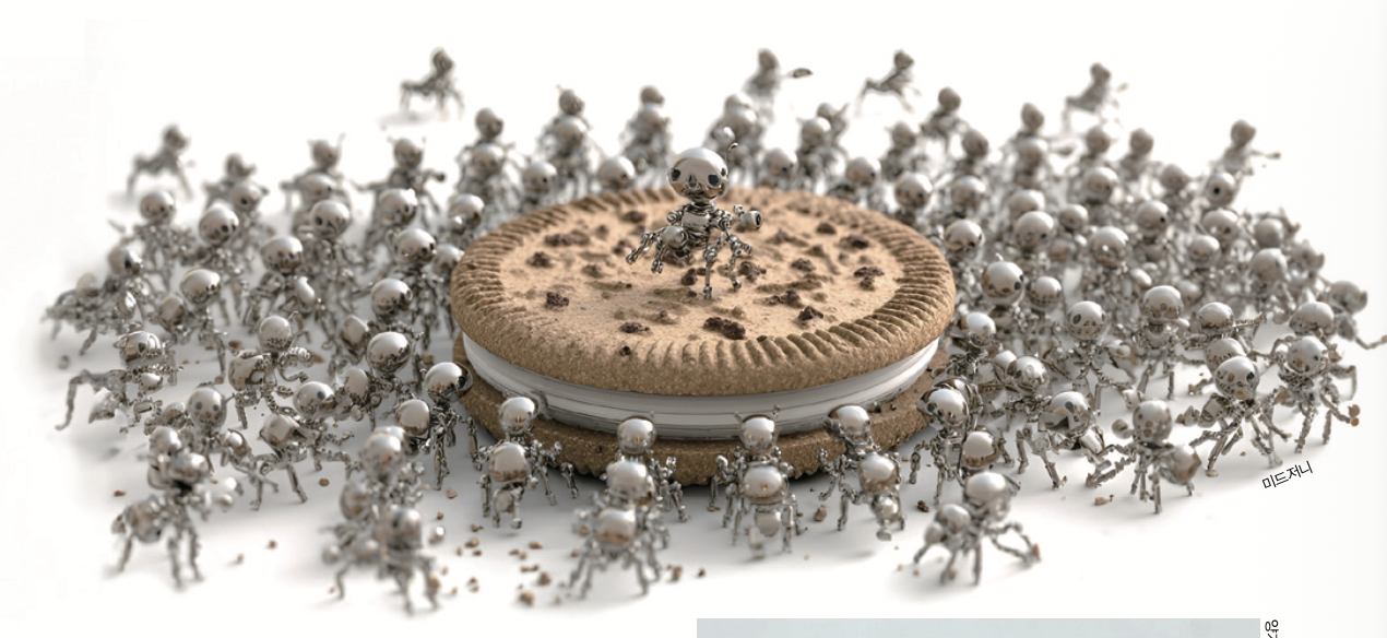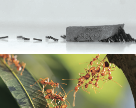 2024년 12월, 한양대학교 유기나노공학과 위정재 교수팀은 여러 임무를 수행할 수 있는 초소형 자성 로봇 군집을 개발했어요. 자기장을 통해 여러 대가 인공혈관, 전선 등에서 함께 움직이며 장애물을 들어 올리거나 파괴해요. 길을 돌아갈 수 없을 땐 장애물을 뛰어넘을 수도 있죠. 한양대학교 첨단소재연구실 양기준 연구원은 “한 마리의 개미가 가진 지능과 수백 마리의 개미 군집이 가진 지능은 다르다”고 말했어요. 그러면서 “개미가 떼를 지어 장애물을 넘거나 뗏목 같은 구조를 만드는 것을 보면서 영감받았다”고 설명했습니다.