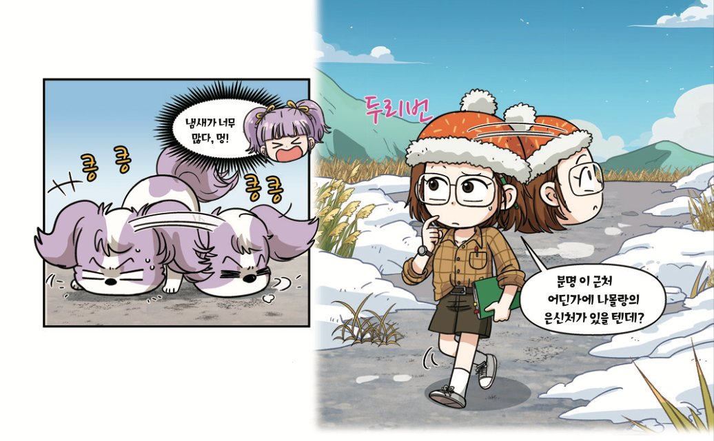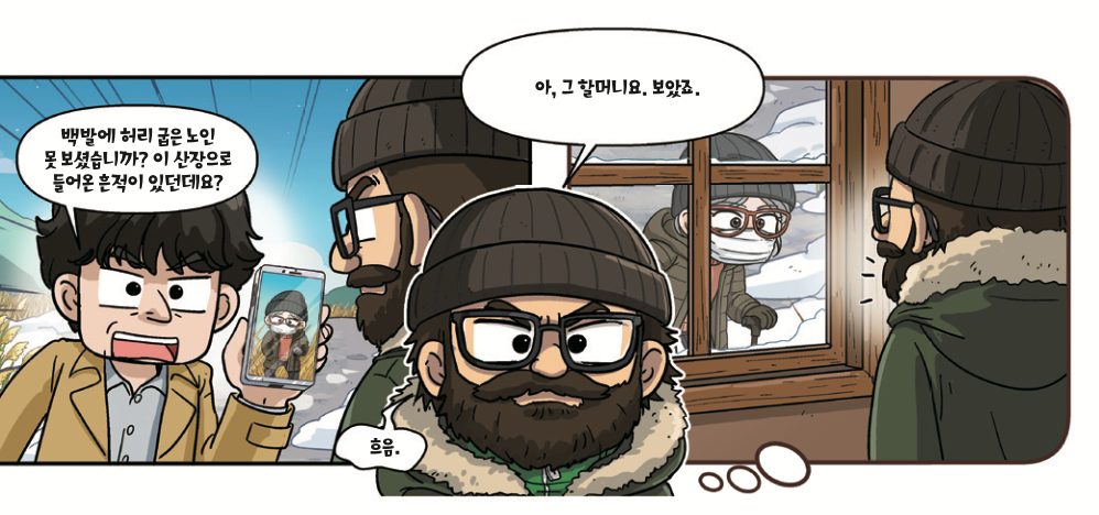 갈대밭에서 어렵게 빠져나온 명탐정과 이 프로, 나는 눈이 녹은 포장도로를 따라 할머니로 변장한 나몰랑이 사라진 쪽으로 향했다. 그러나 도무지 흔적은 보이지 않았다.