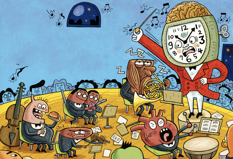 연주가 잘 안 되는 이유를 찾기 위해 여러분의 하루를 살펴봤어. 잘 시간이 됐는데 깨어 있고, 주말엔 실컷 늦잠을 자더군. 이러면 나와 장기들이 연주를 제대로 해낼 수 없다고!