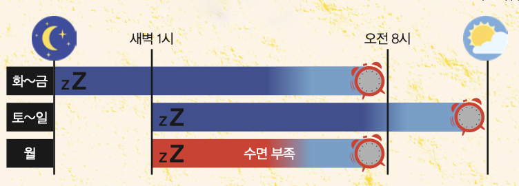 주말에 늦게 자고 늦게 일어난 후엔 자는 시간이 미뤄져 일요일 밤에 제때 잘 수 없게 된다.