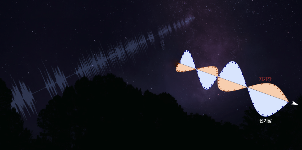 1865년, 영국의 물리학자 제임스 맥스웰은 전기장과 자기장이 서로를 만들며 퍼져 나가는 파동●, ‘전자기파’가 존재한다는 이론을 제시했어요. 전자기파는 전하●의 운동 상태가 변할 때 생겨요. 전하의 주변 공간인 전기장과 운동 중인 전하에 힘을 작용시키는 공간인 자기장으로 이루어지죠. 전하가 움직이면 전기장도 변하는데, 그러면서 자기장이 생겨요. 자기장은 다시 전기장을 만들면서 두 장이 함께 특정한 방향으로 나아가요.