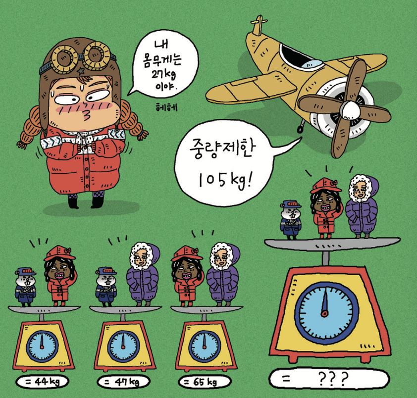네 친구의 몸무게가 얼마인지 각각 맞히고, 넷을 합한 무게가 비행기 중량 제한을 초과하는지 확인해라.