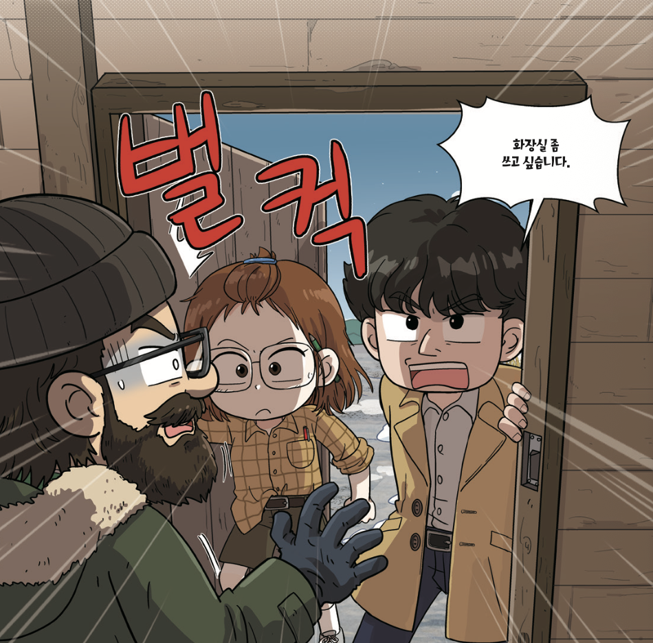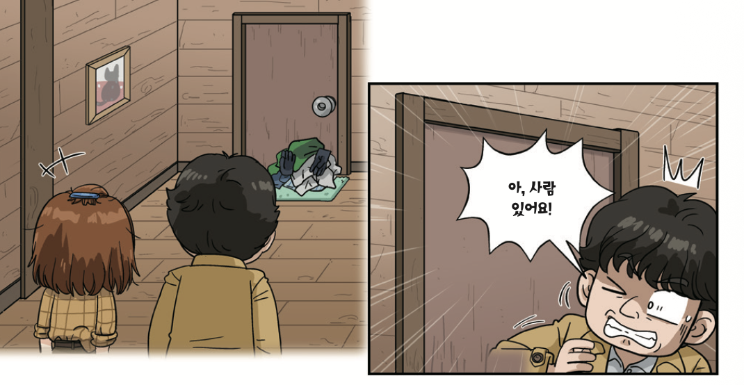 조심스럽게 문고리를 돌리니, 화장실은 굳게 잠겨 있었다. 명탐정이 노크하자 안에서 짜증이 난 소설가인 척하는 사람의 목소리가 들려왔다.