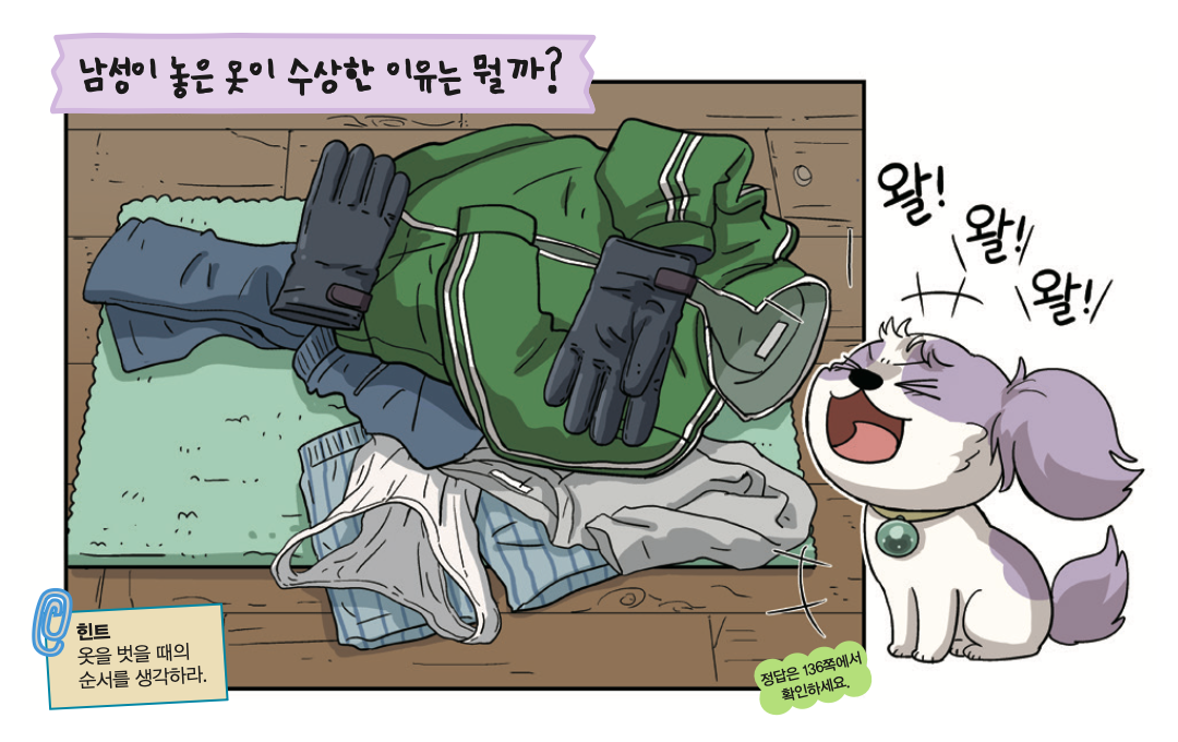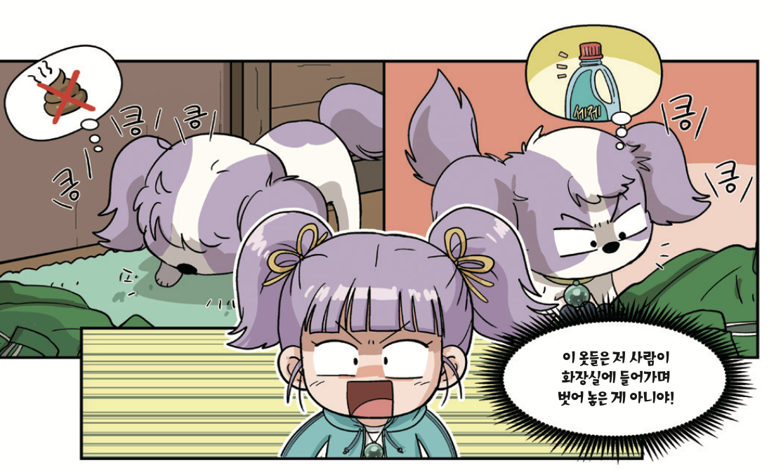 나는 개의 본능대로 화장실 문에 코를 대고 킁킁댔다. 역시나 똥 냄새가 나지 않았다. 나는 벗어 놓은 옷에도 코를 대고 냄새를 맡았다. 그런데 잠바와 장갑을 제외한 다른 옷들은 사람 냄새가 아닌 세제 냄새가 강했다.
