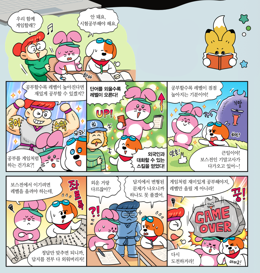 게임처럼 공부하는 방법은 ‘공부도 즐거울 수 있다’는 사실을 알려 줘요. 반복되는 학교생활과 공부에 지칠 때, 게임의 요소를 공부에 활용해 보세요. 매일 새로운 퀘스트와 능력치를 키울 기회가 있다고 생각한다면, 지루하지 않게 공부할 수 있을 거예요!