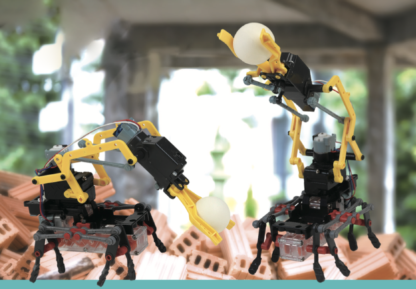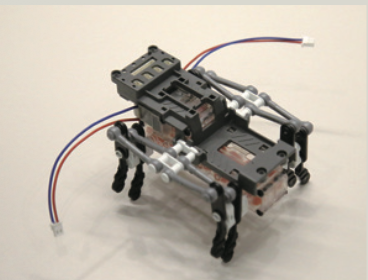 ➊ 보행용 모터 2개를 넣은 투명 기어 박스, 회로가 들어간 짙은 회색 틀, 다리 부품을 합친다.