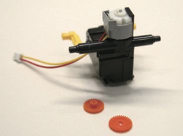 ➋ 기어와 고정대, 모터를 순서대로 넣어서 작은 기어 박스를 완성한 뒤 1번과 합친다.