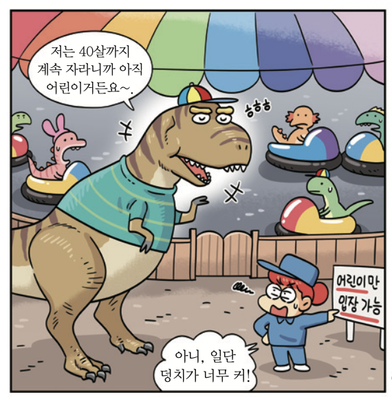 사람은 20살이 되면 다 자란 성인이 돼. 그런데 티라노사우루스는 30살이 됐는데도 아직 몸이 다 자라지 않았대. 믿기지 않아서 직접 물어보고 왔어!