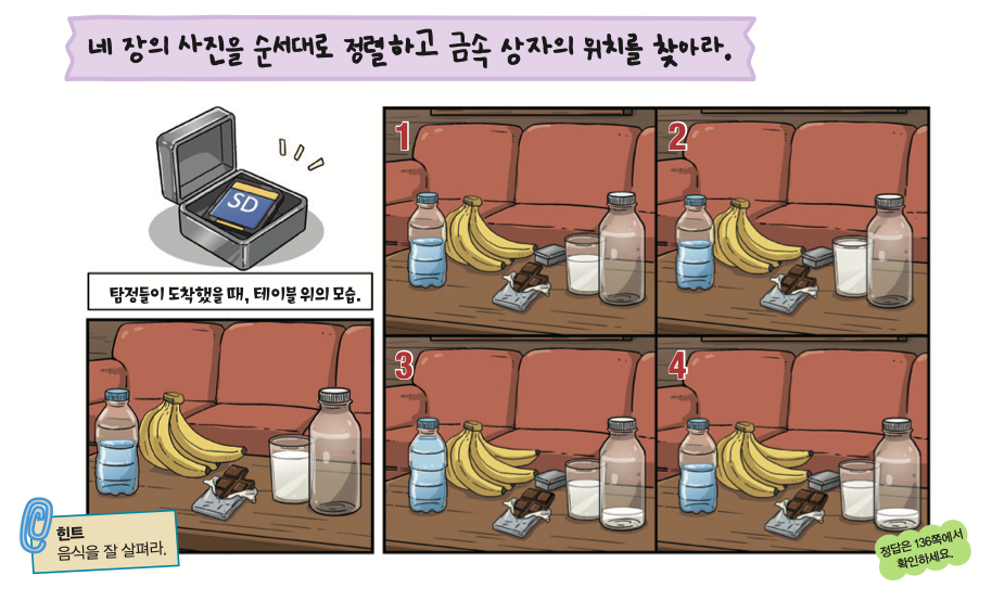 이제 이 프로가 인쇄해 놓은 사진 4장만 남았다. 하지만 그마저도 나몰랑과 탐정들이 몸싸움할 때 뒤죽박죽 섞이고 말았다. 나몰랑이 어느 상자에 메모리카드를 숨겼을까?