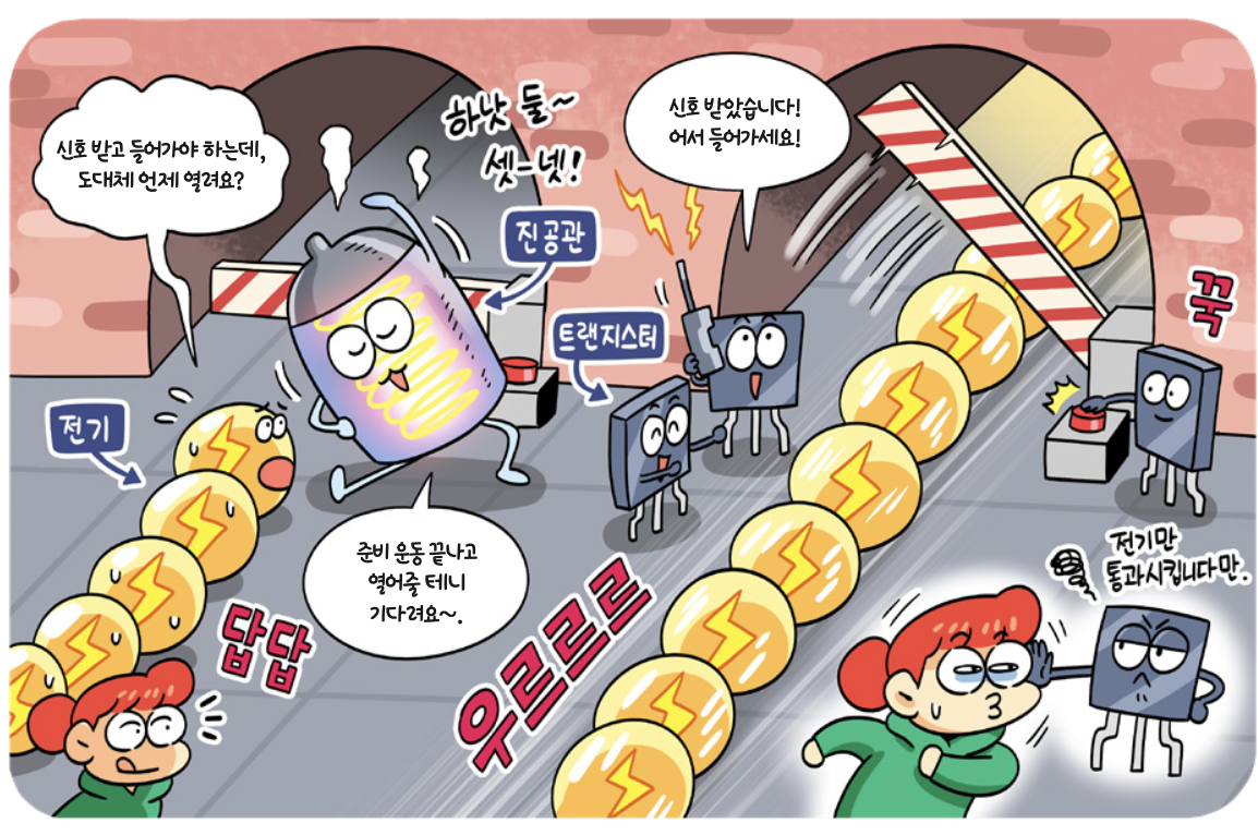 이런 반도체의 성질을 이용해 트랜지스터에 전기가 들어오고 나가는 부분, 그리고 그 흐름을 조절하는 부분을 만들 수 있어요. 흐름을 조절하는 부분에 아주 작은 전기 신호를 주어 전기의 흐름을 열거나 막을 수 있죠. 트랜지스터를 포함해 여러 전자 부품이 연결되어 전자 회로를 이루고, 이 회로를 따라 전기 신호가 따라 움직여요. 트랜지스터가 전기를 켜고 끄는 동작을 반복하면서 회로는 정보를 처리해요.
