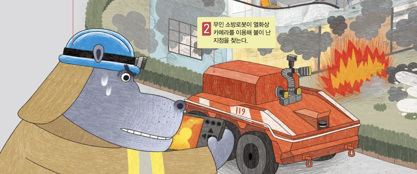 연기가 자욱해 앞이 잘 안 보이면 소방대원이 빠르게 불을 끌 방법을 찾기 어려워 소방로봇을 출동시켜요. 먼저 무인 소방로봇은 멀리 있는 소방대원의 조종에 따라 불이 난 지점을 찾아요. 소방대원은 열화상 카메라로 비치는 화면을 보며 로봇을 조종하고, 불을 끄라는 명령을 내리죠.