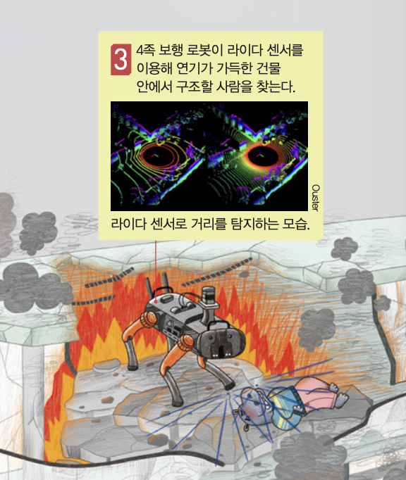 네 발로 걸으며 구조할 사람을 찾는 4족 보행 로봇은 건물 안으로 들어가 계단 등을 이용해 위아래로 이동할 수 있어요. 라이다 센서를 이용해 대피하지 못한 사람들의 위치를 파악하고 소방대원에게 실시간으로 정보를 전송해요. 유독 가스 측정기로는 소방대원들이 화재 현장에 들어가도 안전한지 확인하죠.