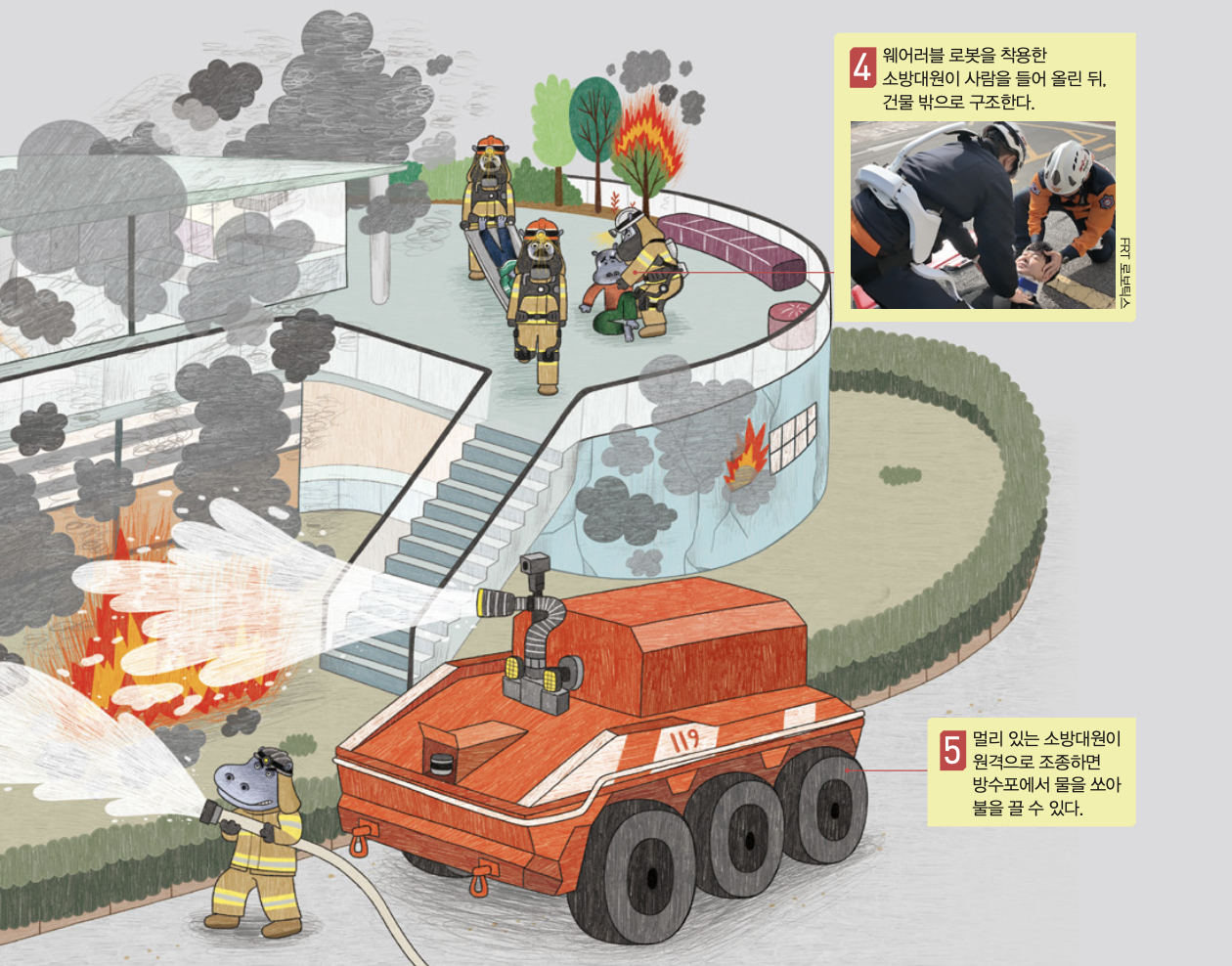 소방대원이 들어가도 된다면, 소방대원은 건물 안으로 들어가 4족 보행 로봇이 보낸 위치에 있는 사람을 구해요. 이때 소방대원은 옷처럼 입는 웨어러블 로봇의 도움을 받을 수 있어요. 웨어러블 로봇은 소방대원이 무거운 사람이나 장비를 반복해서 들어 옮길 때 허리나 관절에 무리가 가지 않도록 힘을 보태주는 역할을 해요. 우리나라에서는 IT기업 FRT 로보틱스가 연구하고 있죠.