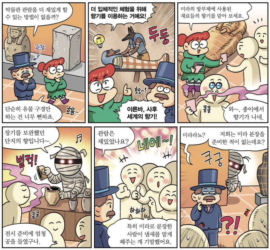 2월 5일, 미국 디 올팩토리 컨트랙터 외 국제 연구팀은 3500년 전 고대 이집트 미라 방부제의 향기를 만들어 냈다고 국제 학술지 ‘환경 고고학 프런티어’에 발표했어요. 연구팀은 이집트 귀족의 장기를 담았던 단지에 어떤 냄새를 내는 분자가 존재하는지 분석했어요. 분석을 통해 방부제에 사용된 기름, 밀랍 등이 어떤 것인지 알아냈죠. 이를 토대로 향수를 만드는 조향사와 함께 당시 사용된 방부제의 냄새를 만들어서 ‘사후 세계의 향기’라 이름 붙였어요. 박물관에서 이 냄새를 맡은 관람객들은 “유물을 보는 것에 더해, 냄새까지 맡아 더 빠져들 수 있었다”고 말했습니다.