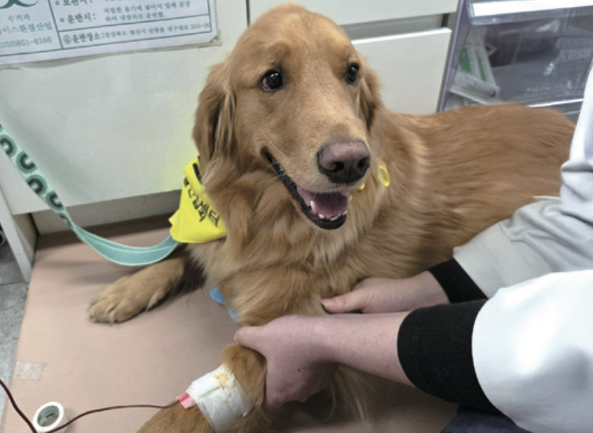 개도 사람처럼 수술할 때나 많이 다쳤을 때 외부에서 몸으로 피를 넣어주는 수혈이 필요해요. 이때, 수혈에 필요한 피를 사람처럼 뽑아서 기증하는 반려견을 헌혈견이라고 해요.