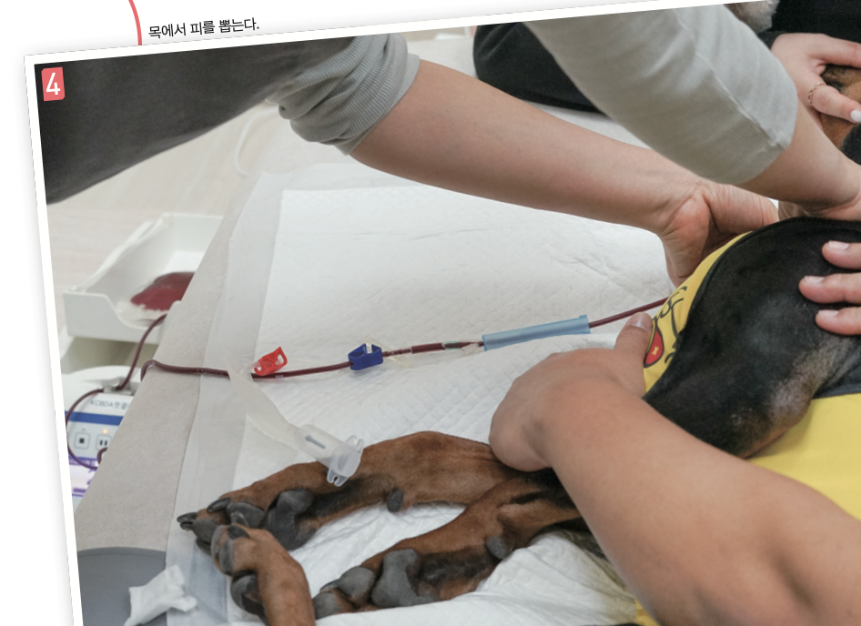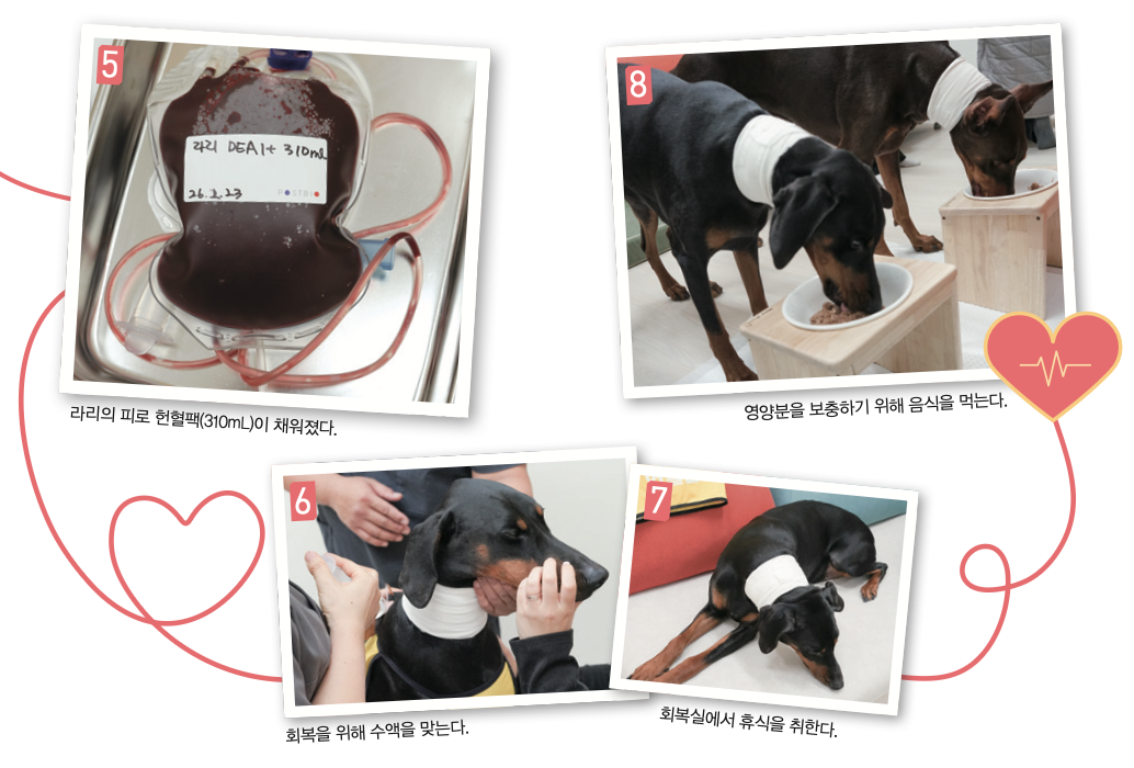 피를 뽑는 채혈실로 들어간 라리는 진료대 위에 누웠어요. 수의사가 라리의 목 부분에 주삿바늘을 꽂기 위해 소독을 했죠. 스트레스받는 시간을 줄이기 위해, 개는 목의 굵은 혈관에서 빠르게 피를 뽑아요. 바늘이 들어갈 때는 훈련사와 보호자가 라리를 안정시켰어요. 잠시 후 310mL, 혈액 한 팩이 채워졌어요. 헌혈이 끝난 라리는 수액을 맞고 음식을 먹으며 회복했어요.