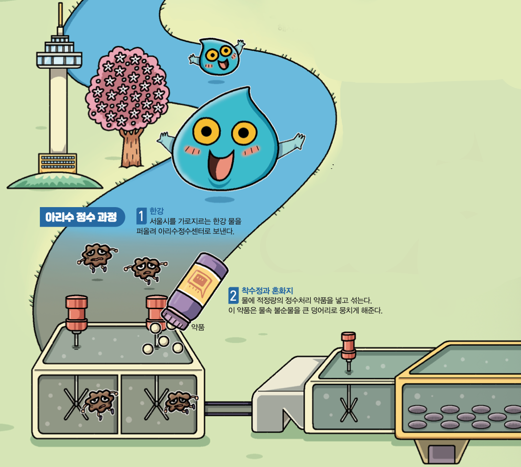 아리수정수센터에서는 총 8단계의 정수 과정을 거쳐요. 먼저 한강에서 퍼올린 물은 착수정과 혼화지로 이동해요. 이곳에서는 약품을 넣어 물속의 불순물들이 서로 뭉치도록 도와줘요.