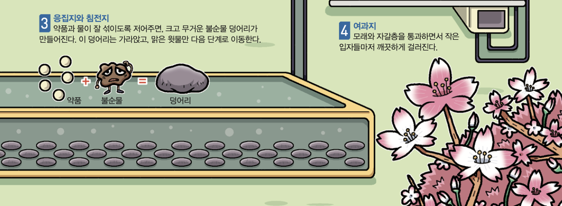 약품과 물이 잘 섞이도록 저어주면, 크고 무거운 불순물 덩어리가 만들어진다. 이 덩어리는 가라앉고, 맑은 윗물만 다음 단계로 이동한다.