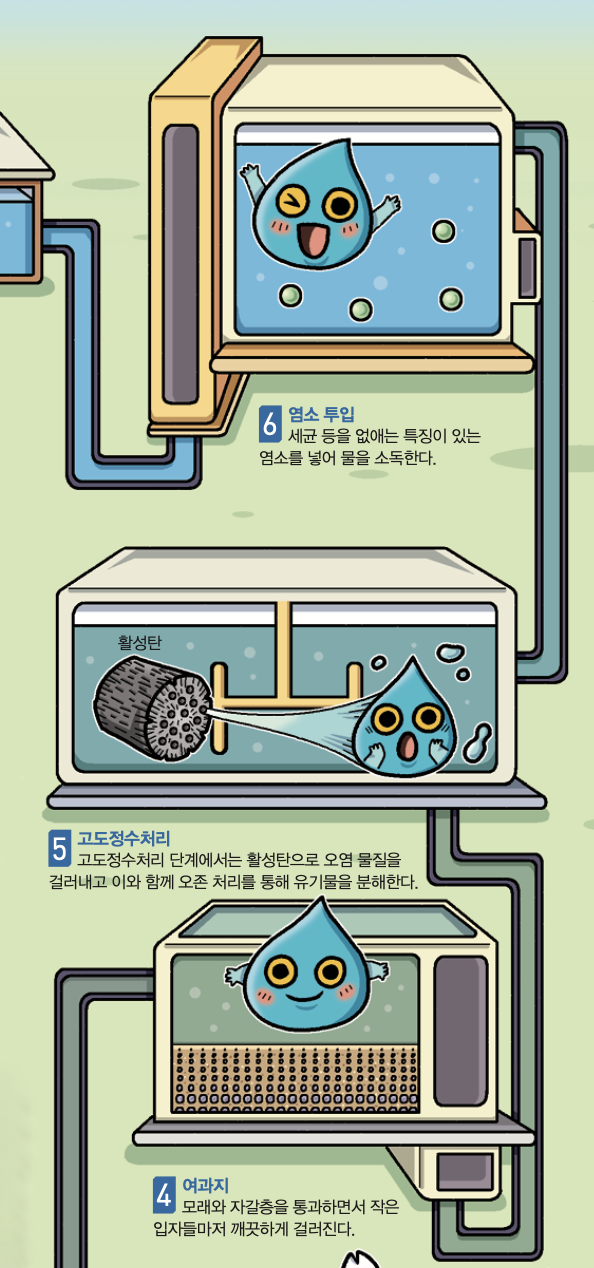 침전지를 통과한 물은 여과지로 이동합니다. 여과지 바닥에는 모래와 자갈층이 깔려 있어 물속에 남아 있던 작은 입자까지 한 번 더 걸러내요. 이후 물은 고도정수처리 단계로 이동해 활성탄을 거칩니다. 활성탄은 다른 물질을 붙잡는 힘인 흡착력이 강한 물질이에요. 물속에 남아 있던 미세한 오염 물질과 냄새를 유발하는 물질이 활성탄에 달라붙으면서 물은 더욱 깨끗해집니다.