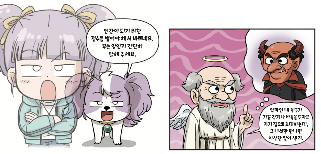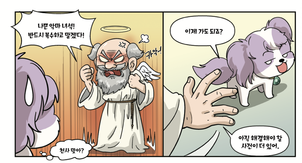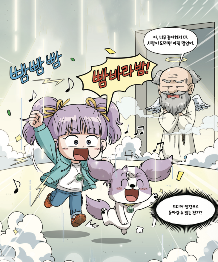 사건을 해결하자 멍 탐정인 나의 목에 걸린 목걸이가 번쩍이며 팡파르가 울렸다. 나는 신이 나서 펄쩍펄쩍 뛰었다. 그 순간, 내 주변이 하얀 방으로 바뀌더니 천사 마요네즈가 나타났다. 사고 날 때 본 그 천사였다!