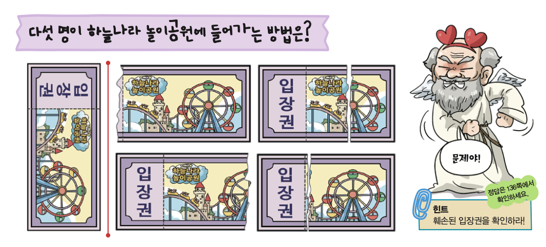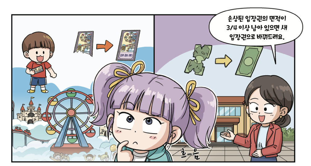 “그래. 네가 사는 대한민국의 한국은행과 비슷하지. 한국은행에서는 돈이 불에 타거나 훼손되면 새 돈으로 바꿔 주잖아. 돈의 남은 면적이 4분의 3 이상이면 같은 액수의 새 돈으로 말이야. 우리 하늘나라 놀이공원도 마찬가지야. 입장권이 4분의 3 이상 남아 있으면 새 입장권으로 바꿔주고 있지.”