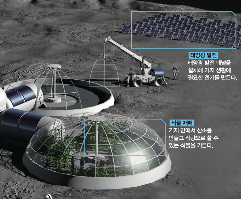 기지 주변에는 우주비행사를 돕는 시설이 설치될 거예요. 먼저 전기를 만들기 위해 햇빛이 잘 드는 곳에 태양광 발전기나 소형 원자로를 놓을 계획입니다. 기지에서 나오는 쓰레기를 모으는 공간, 우주비행사가 이동할 도로, 산소를 만들고 식량을 생산하기 위한 식물 재배 시설 등도 필요해요.