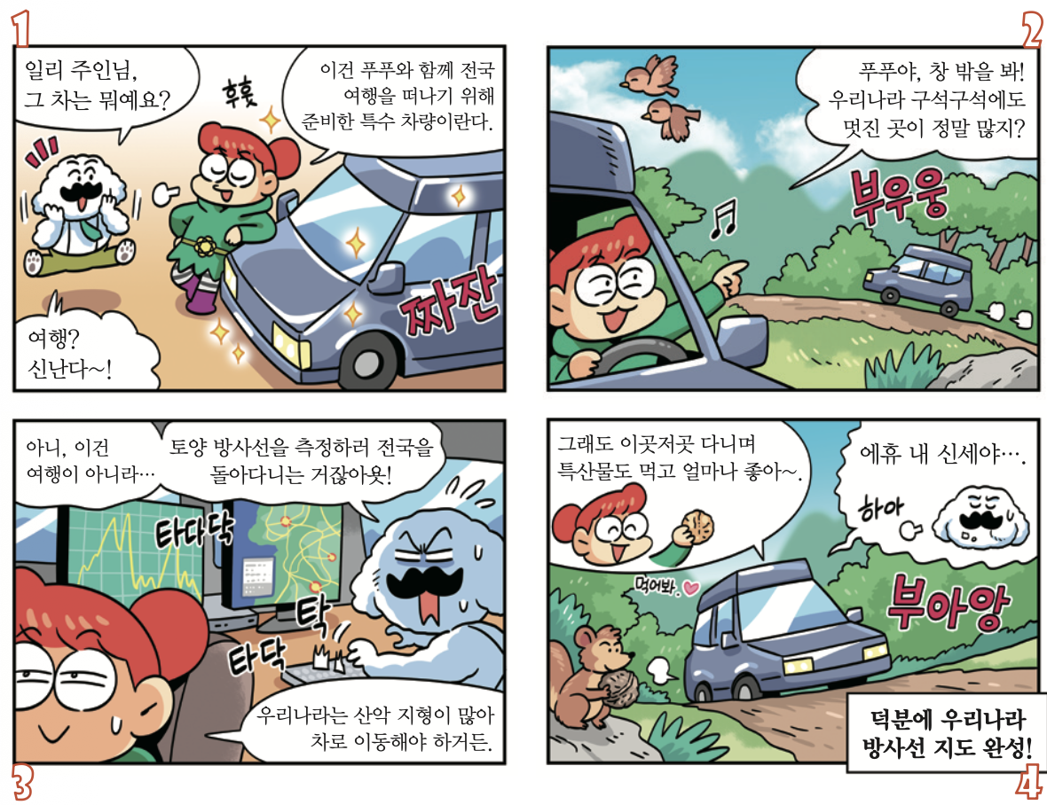 연구팀은 2013년 8월부터 약 4년간 특수차 2대를 개발해, 전국 도로 약 12만 km를 주행했어요. 그리고 우리나라 국토에 분포한 자연방사선의 농도를 알아냈습니다. 그 결과, 다른 방사선에 비해 칼륨이 높게 측정됐어요. 우리나라 땅 대부분이 칼륨이 많이 포함된 화강암으로 이루어져 있기 때문이에요.