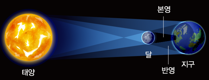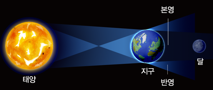 태양은 스스로 빛을 내요. 반면 지구와 달은 스스로 빛을 내지 못하고 태양 빛을 반사해 빛나요. 빛은 직진하기 때문에 태양 빛을 받는 면은 밝게 빛나지만, 반대쪽 면에는 그림자가 생깁니다. 그림자 가운데 완전히 어두운 부분을 ‘본영’, 바깥쪽의 살짝 어두운 부분은 ‘반영’이라고 해요.