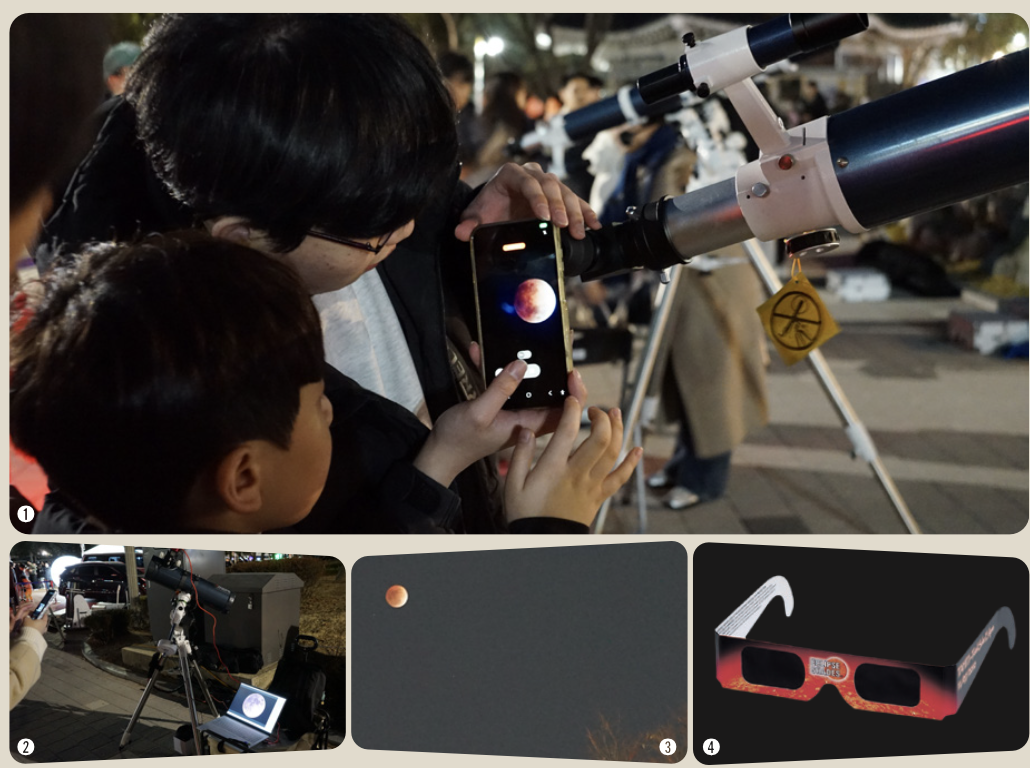 이날 행사에는 LED 쥐불놀이, 별자리 배지 만들기, 목성 관측 등의 체험들도 마련됐습니다. 어린이들은 망원경으로 개기월식을 보는 것뿐 아니라 우주와 관련된 체험을 하며 즐거운 시간을 보냈어요. 가족과 함께 관측 행사에 참여한 최유안 어린이는 “개기월식을 망원경으로 본 것은 처음이다”고 말했습니다. 또한 “달이 점점 작아지다가 붉은색으로 변하는 것이 신기했다”고 전했습니다.