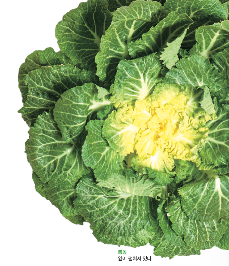 이런 모양은 봄동이 자라는 환경과 관련이 있어요. 봄동은 9월, 씨앗을 흙에 뿌리는 파종을 하고 1~3월인 한겨울이나 초봄에 수확해요. 기온이 낮은 겨울에 봄동은 햇빛을 더 많이 받기 위해 잎을 넓게 펴며 자랍니다. 즉, 낮은 온도에 적응하며 생긴 모양이지요.