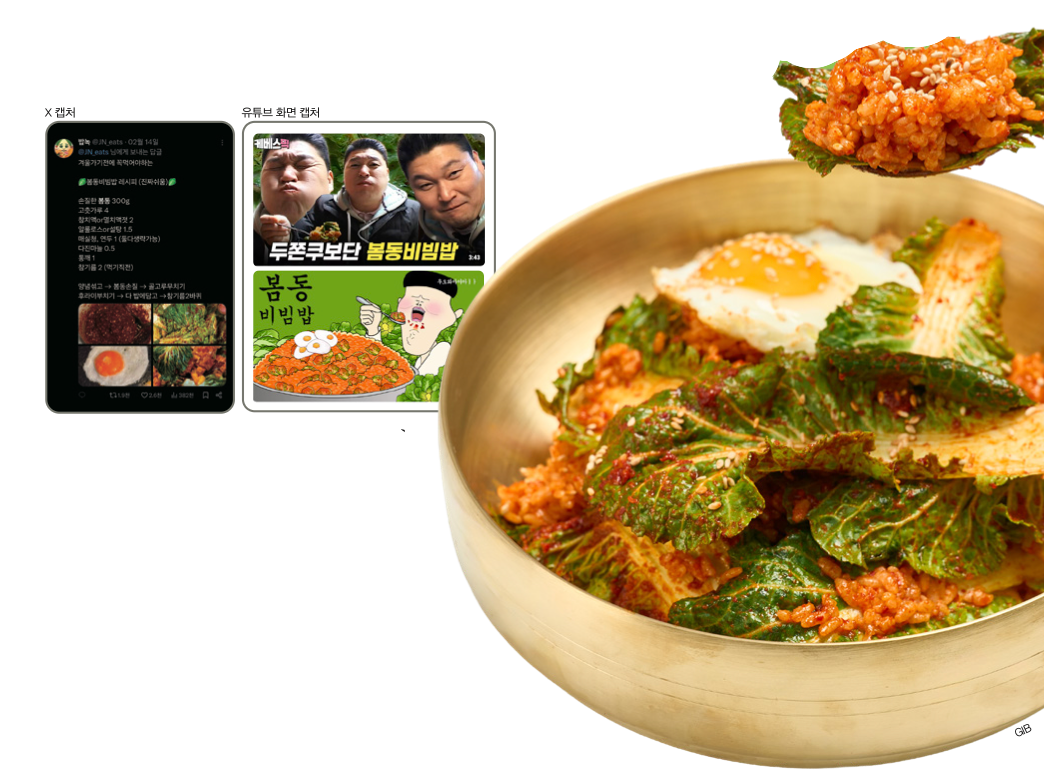 최근 소셜 미디어에서는 봄동 비빔밥 영상이 화제가 되고 있어요. 2008년에 방영된 예능 프로그램 ‘1박 2일’에서 방송인 강호동 씨가 봄동 비빔밥을 먹는 장면이 다시 주목받고 있기 때문이에요. 이 영상을 계기로 봄동 비빔밥을 따라 만들거나, 조리법을 공유하는 영상이 잇따라 올라오며 많은 사람의 관심이 이어지고 있습니다.
