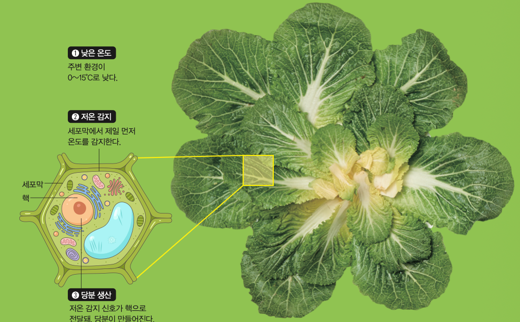 그 결과, 온도가 낮아지면 식물 안의 세포 구조 중 세포막이 가장 먼저 온도를 감지했어요. 세포막은 세포를 둘러싸는 막이에요. 온도에 따라 세포막이 단단해지며 세포막의 구조가 변하면, 칼슘 이온이 세포 안으로 들어와요. 이후, 세포 안에서 활성산소, 일산화질소와 같은 물질이 만들어지며 저온을 감지하는 신호가 형성됩니다. 이 신호는 세포의 핵으로 전달돼, 저온에 반응하는 유전자를 활성화해요. 그 결과 식물은 당을 더 많이 만들게 됩니다. 당이 많아질수록 식물의 외부와 내부의 삼투압●이 조절돼 식물이 얼지 않게 도와줘요.