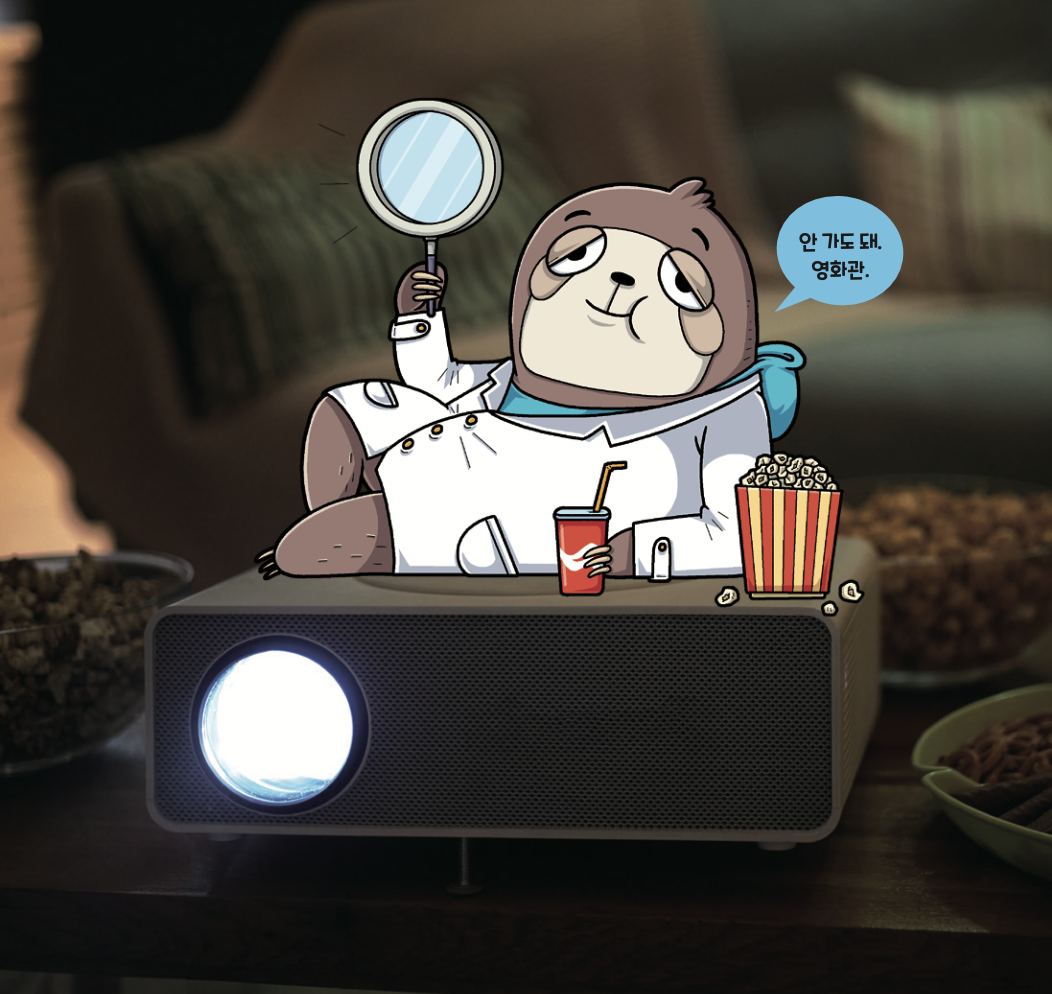 나무늘보 기자는 영화관에 가고 싶지만, 최근 영화 ‘왕만두 사는 남자’ 열풍으로 관객들이 붐벼 도무지 갈 수 없었어요. 고민하던 나무늘보 기자는 집에서도 커다란 화면으로 영화를 볼 방법을 떠올렸어요.