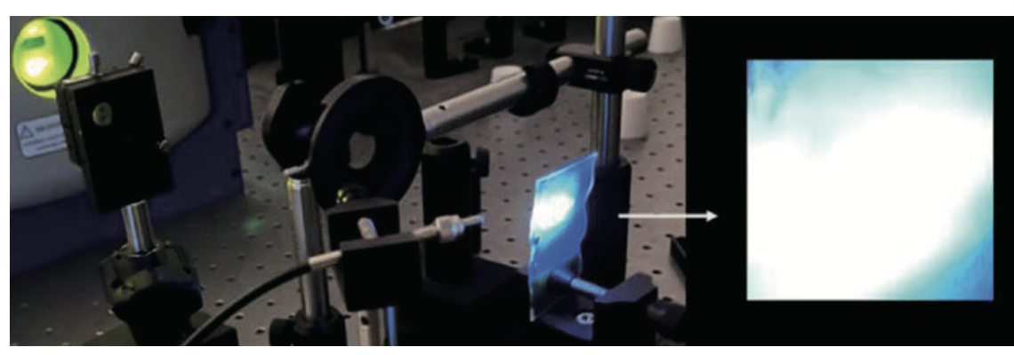 연구팀이 개발한 백색 발광 필름은 빛을 받으면 이런 백색광을 뿜어내면서도, 필름처럼 얇고 자유롭게 구부릴 수 있어요. 기존의 백색광 소재는 가루 형태거나 두껍고 단단한 코팅으로 만들어져 쉽게 깨지는 경우가 많았어요. 연구팀은 빛을 내는 염료에 고분자 사슬 소재를 정교한 비율로 섞었어요. 고분자 사슬은 매우 작은 분자들이 길게 이어진 구조예요. 잘 구부러지고 다른 물질을 안정적으로 잡아두는 특징이 있죠. 덕분에 연구팀이 만든 필름은 얇고 투명하면서 유연하고, 다양한 파장의 빛을 균형 있게 내는 데 성공했어요. 필름에 레이저 등으로 빛을 쏘면, 우리 눈은 필름을 통해서 퍼져나가는 빛들을 환한 백색광으로 받아들이죠.