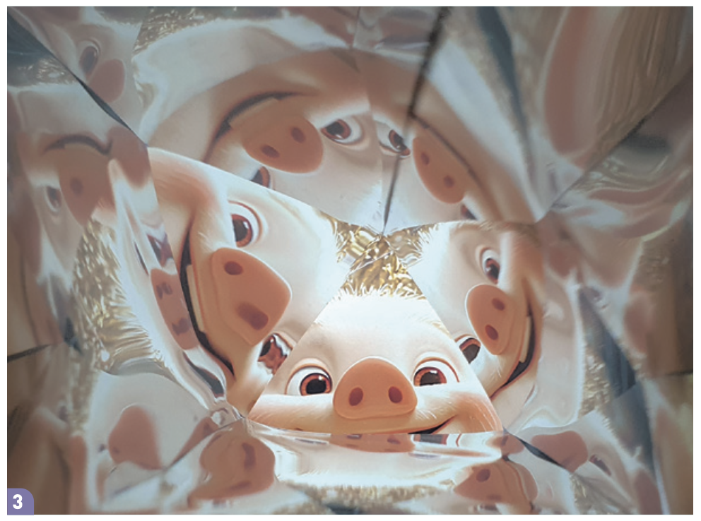 거울 종이로 만든 삼각기둥 안쪽에서는 밖에서 들어온 빛이 거듭 반사돼요. 삼각기둥을 통해 본 물체는 안쪽 거울 종이 면의 개수인 3개보다도 훨씬 더 많은 개수로 보이죠. 가운데 부분에는 6개의 무늬가 대칭하게 나타나고, 이 무늬가 또 맞은편 면에 반사되며 수십 개로 늘어나요.
