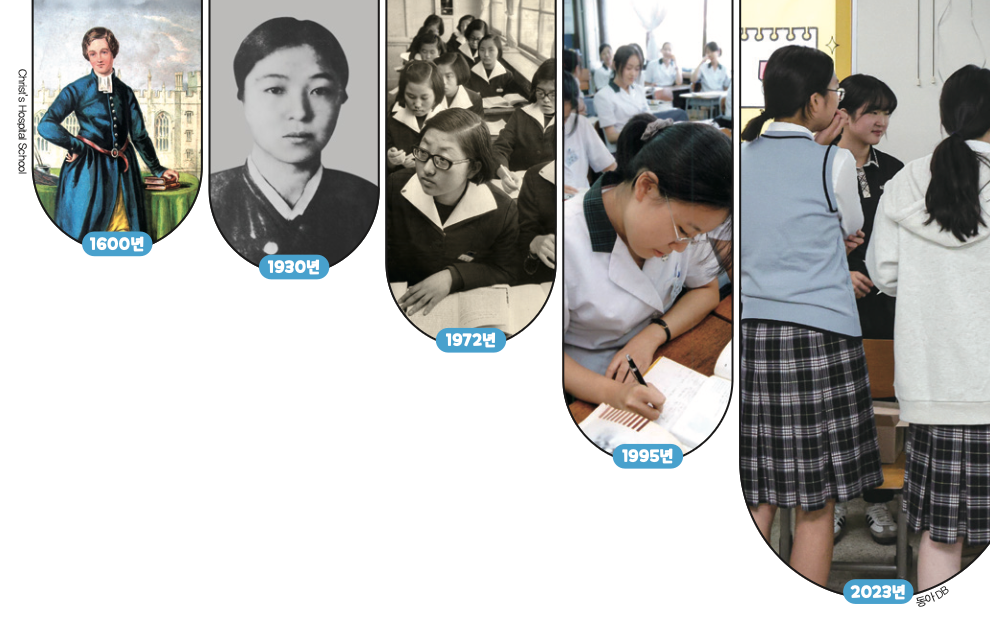 우리나라는 일제강점기인 1900년대 초부터 일본 학교 제도의 영향으로 서양식 정장형 교복을 입기 시작했어요. 1982년부터는 학생들의 개성과 자유를 보장하기 위해 교복을 없애는 ‘교복자율화 제도’를 시행했지만, 한 반에 60명 이상의 학생이 있던 시기라 학생과 학생이 아닌 사람을 구분하기 어려운 등 문제가 있었어요. 결국 1985년부터 우리에게 익숙한 형태의 정장형 교복을 다시 입게 됐죠.