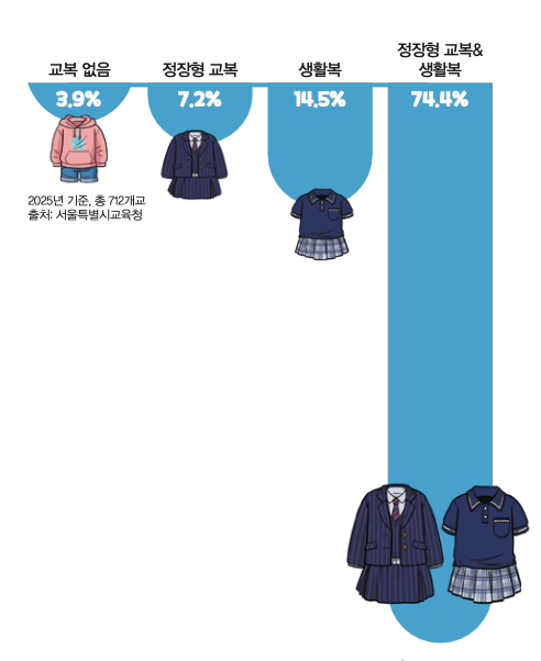 교복에 대한 학생들의 생각은 코로나19 이후로 빠르게 바뀌었어요. 한동안 학교에 가지 않고 온라인 수업을 들은 학생들은 교복을 입을 필요가 없었죠. 그래서 학생들은 다시 학교에 가서 수업을 들으면서도 격식보다는 편안함을 선호하게 됐어요. 서울시의 경우 생활복 단독 또는 정장형 교복과 생활복을 함께 입는 학교의 비율이 2019년 64.2%였다가, 2025년에는 88.9%로 크게 늘었습니다.