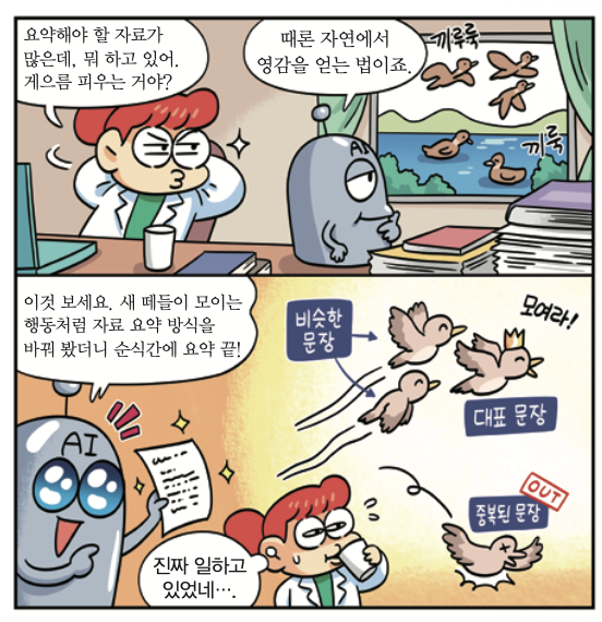 새가 떼를 지어 날 때는 마치 하나의 생명체처럼 일사불란하게 움직이면서 날아. 새들은 주변에 있는 새들과 서로 비슷하게 움직여. 가까이서 날면서 방향을 맞추고, 그중 리더인 새를 중심으로 삼아 따라가지. 연구팀은 글을 하나의 새 떼로 봤어. 그리고 한 문장을 한 마리의 새로 생각했지. 그다음 문장의 내용, 중심 주제, 주제와의 관련성을 기준으로 문장을 평가하고, 새 떼가 나는 방식처럼 문장을 묶어서 글을 요약했어.