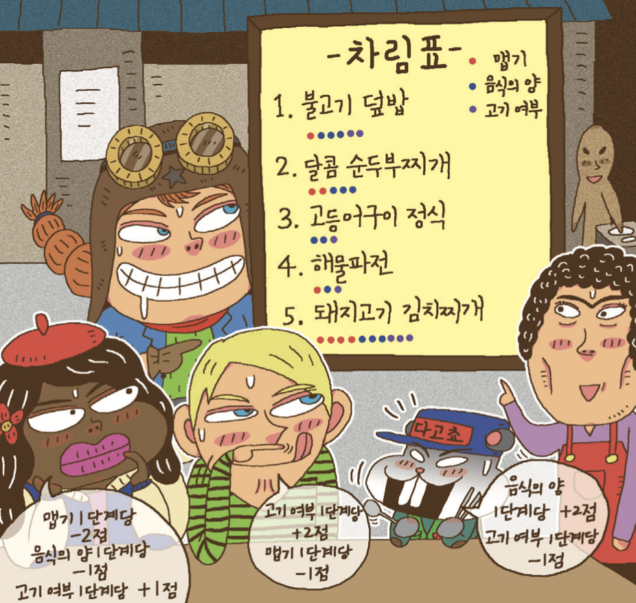 “이 원들은 각각 맵기, 음식의 양, 재료를 나타내는 거예요. 가장 입맛에 맞는 음식을 골라보세요!”