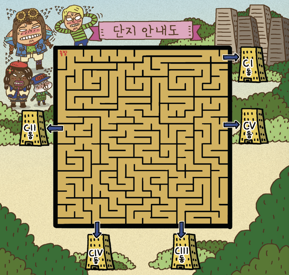 미로를 풀고 105동으로 가는 길을 찾아라.