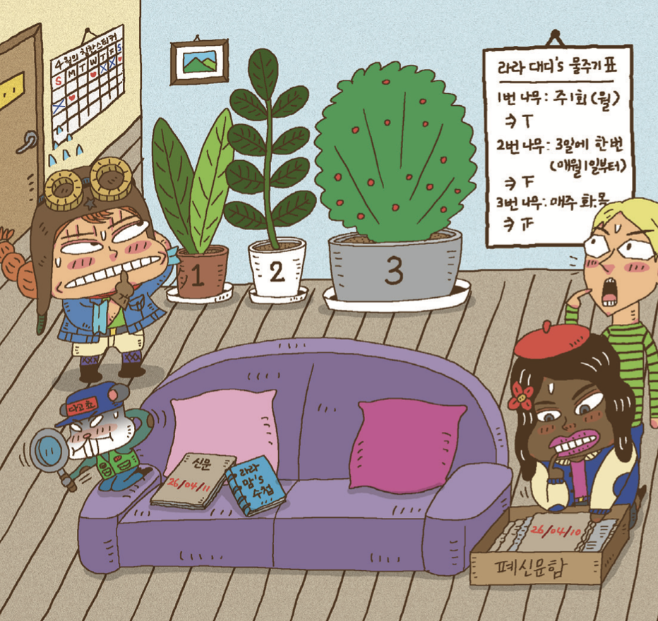 라라올라는 자주 가던 한식집으로 친구들을 안내했다. 세 친구 모두 한국에 온 것이 처음이라, 어떤 음식을 골라야 좋을지 한참 동안 고민했다. 라라올라는 친구들을 돕기 위해 차림표를 가리키며 설명했다.