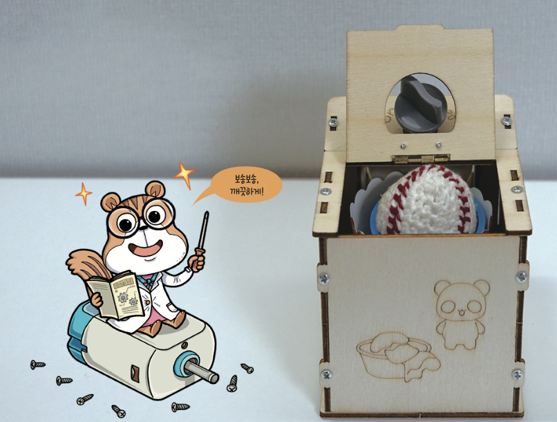 다람쥐 기자는 매일 가방에 야구공 키링을 대롱대롱 달고 다녀요. 그러다 이 키링이 꼬질꼬질해진 것을 발견했어요. 속상한 다람쥐 기자는 자그마한 타이머 세탁기를 만들어 인형을 빨아 보기로 했지요.