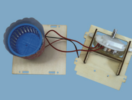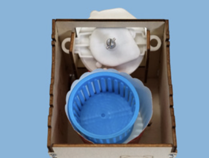이제 원심력을 이용해 시간에 맞춰 옷을 빠는 타이머 세탁기를 만들어 볼 거예요. 먼저 세탁기 안 세탁 통을 돌릴 모터와 시간을 정하는 타이머를 연결해요. 그리고 세탁기 겉판을 순서에 따라 조립하면 타이머 세탁기를 사용할 수 있어요. 타이머 스위치 손잡이를 ON 방향으로 돌리면, 타이머 세탁기 완성!