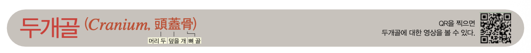 두개골은 척추동물의 머리를 둘러싼 뼈예요. 두개골은 크게 뇌두개골과 안면두개골로 나눌 수 있습니다. 뇌두개골은 뇌를 보호하는 뼈로, 이마뼈와 관자뼈, 뒷통수뼈 등 8개의 뼈로 구성돼 있어요. 안면두개골은 눈, 코, 입과 같이 얼굴에 있는 감각기관을 지지하는 뼈로, 15개가 있습니다. 코뼈, 눈물뼈, 광대뼈 등이 대표적인 안면두개골이지요.