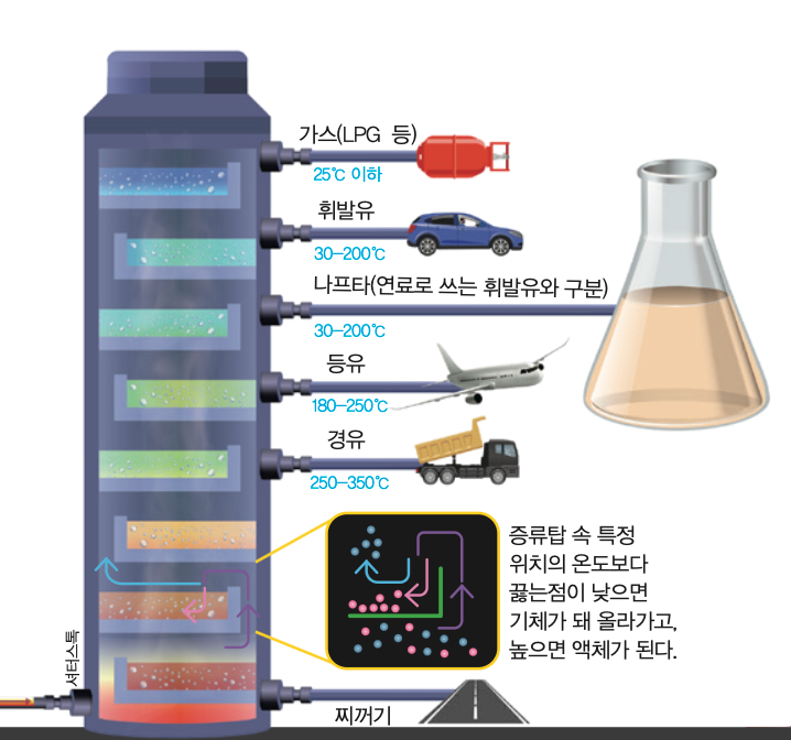 반면 끓는점이 높은 무거운 물질은 기체가 돼 올라가다가 자신의 끓는점보다 온도가 낮아지면 다시 액체가 돼요. 증류탑의 층마다 모인 액체를 모아 분리하면 등유, 경유, 휘발유 등 끓는점이 비슷한 물질끼리 모입니다. 나프타는 끓는점이 약 30~200℃로 비교적 낮아 위쪽에서 분리돼요.