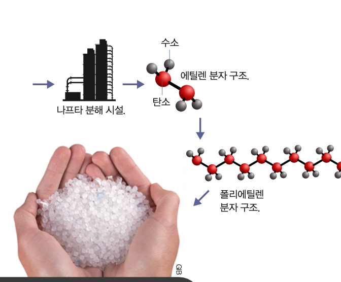 나프타에서 얻은 탄화수소 분자는 같은 것을 길게 이어 붙이거나, 다른 분자와 결합해 고분자로 만들어요. 에틸렌끼리 길게 이으면 종량제 봉투 등 비닐과 플라스틱을 만드는 폴리에틸렌이 돼요. 프로필렌을 길게 이은 폴리프로필렌으로 단단한 플라스틱을, 부타디엔과 다른 물질을 결합하면 타이어에 쓰이는 합성고무를 만들 수 있죠.