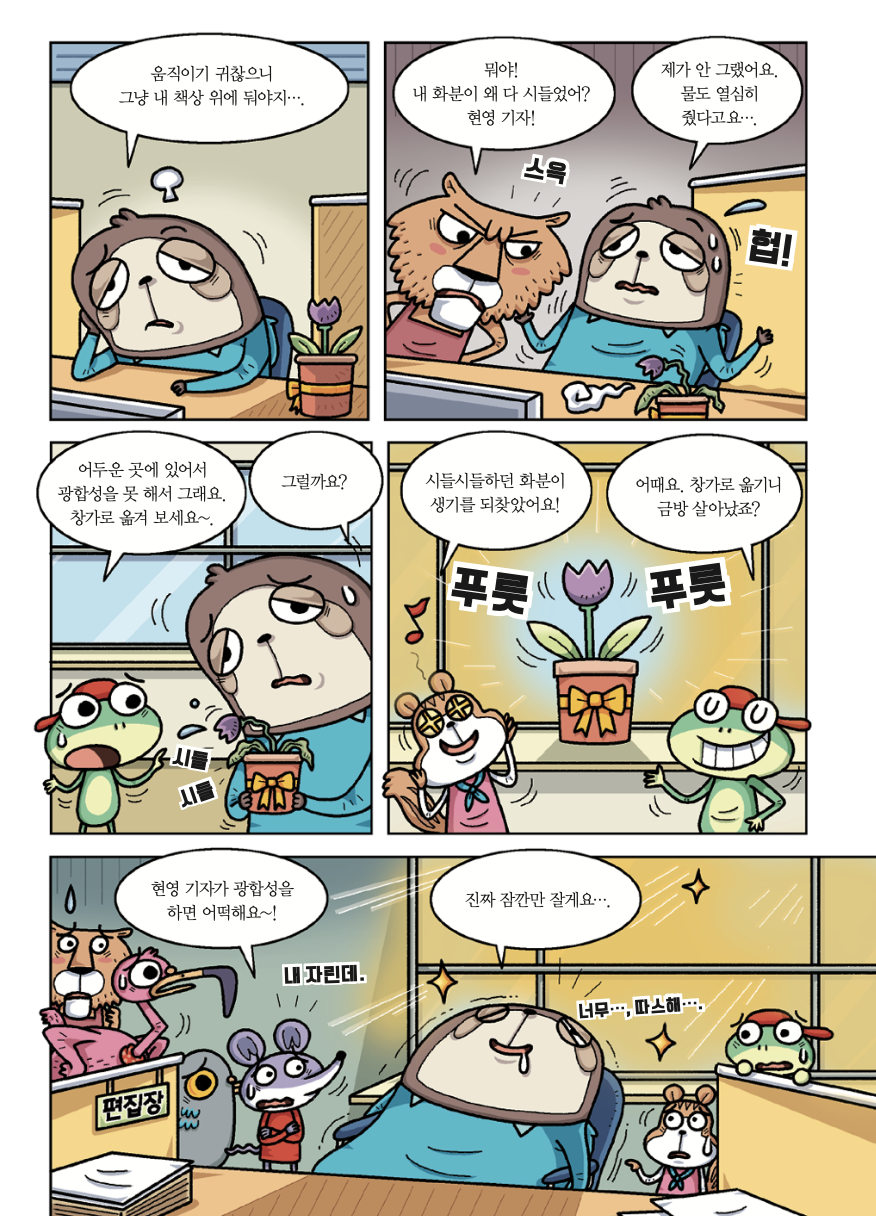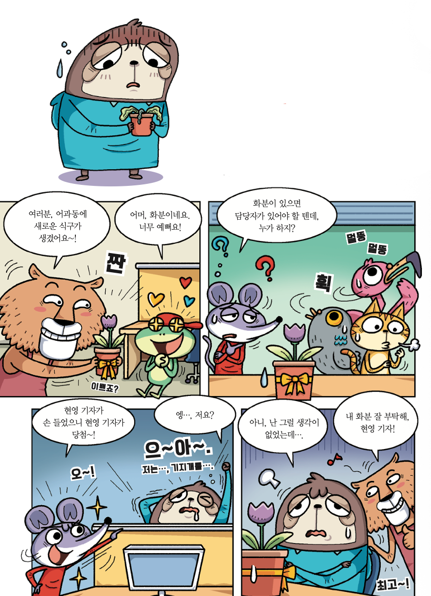 <어린이과학동아> 사자 디자이너가 편집부 사무실에 화분을 들고 왔어요! 뜻하지 않게 화분을 담당하게 된 나무늘보 기자, 과연 화분을 잘 키울 수 있을까요?