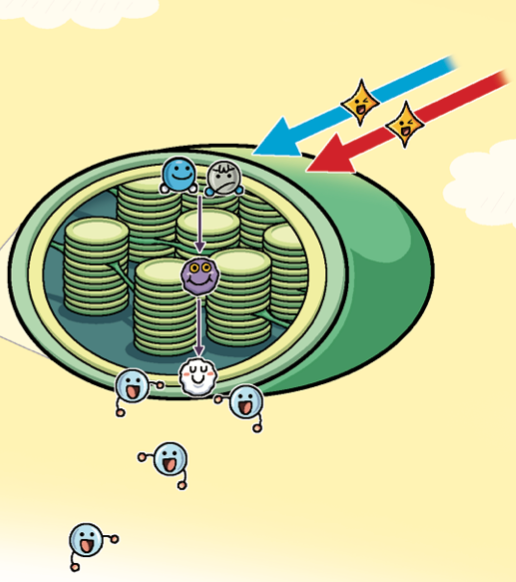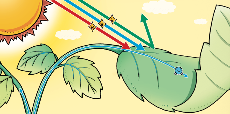 광합성은 식물 세포 안의 세포 소기관, 엽록체에서 일어나요. 엽록체에는 엽록소라는 색소가 있어요. 엽록소는 빨간색과 파란색 빛은 흡수하고, 초록색 빛은 대부분 반사해요. 그래서 엽록소는 초록색을 띠고, 엽록소가 많이 들어 있는 식물은 초록색으로 보여요.